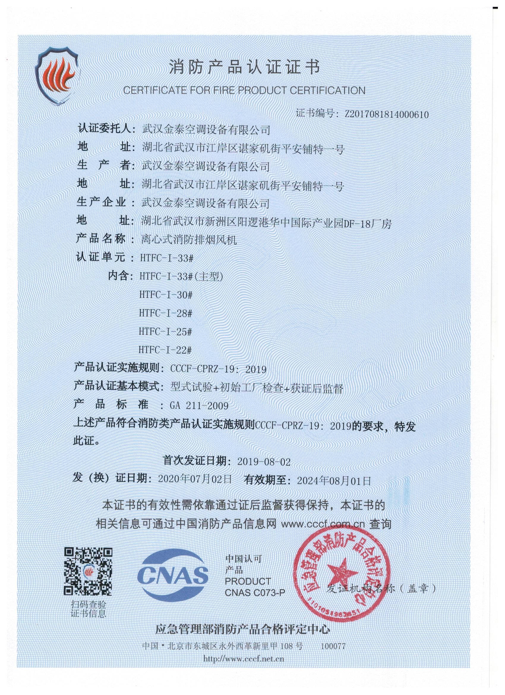 武漢金泰空調設備有限公司 是國內長期專注于民用風機、工業風機領域的標桿企業:專業生產消防排煙風機系列、排煙防火閥系列、一般通風機系列(軸流式、離心式、屋頂式、壁式、隧道式、射流式)、風口、風管等消防及通風設備。產品經公安部消防產品合格評定中心評定符合消防產品CCC標準;經中國合格評定國家認可委員會認證的檢驗所檢驗合格;經國家防火建材質量監督檢驗中心(四川中心)火燒實驗,耐火性能達標。